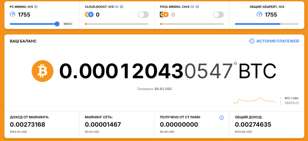 ДОХОДНОСТЬ: Чем мощнее видеокарта и процессор, тем выше хэшрейт. Но не расстраивайтесь, если у Вас старое оборудование, то можно подключить (платный сервис) Пул (pool) майнинг : он использует облачные сервисы, и разгоняет генерацию биткойнов до максимума. Пул майнинг Вы найдете вверху панели управления, третий ползунок на фото выше). Я пользовалась им около недели, прирост был ощутимый. Но все же, я рекомендую начинать с классического способа (включить первый ползунок и расслабиться), он не требует дополнительных вливаний средств на старте.
